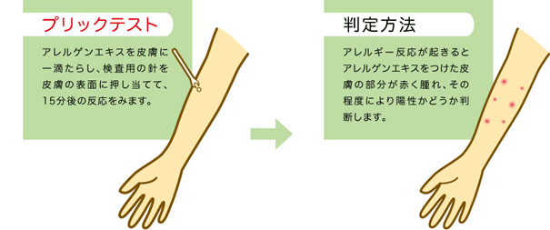 アレルギー反応はプリックテストという検査で計測できます。プリックテストとは、皮膚にアレルギーを引き起こすアレルゲン液を1滴落として特殊な針で皮膚をひっかき、15分後に皮膚の膨れの直径を測定する方法のことです。