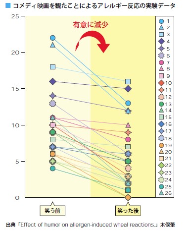 実験では、コメディ映画を観るグループと天気予報を観るグループに分け、各映像の視聴の前後にアレルギー反応の程度を測定しました。